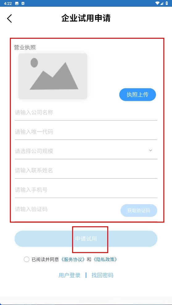 3、在企業(yè)試用申請(qǐng)頁(yè)面,上傳營(yíng)業(yè)執(zhí)照,填寫(xiě)公司信息后點(diǎn)擊【申請(qǐng)?jiān)囉?按鈕】。