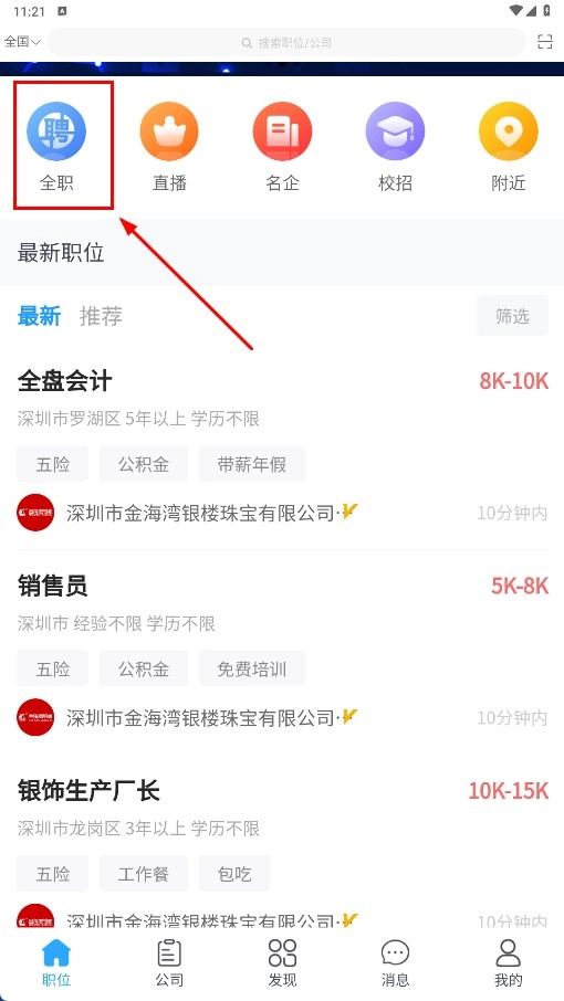 2、在求職頁(yè)面點(diǎn)擊【全職-職位分類】,查看全職職位列表。
