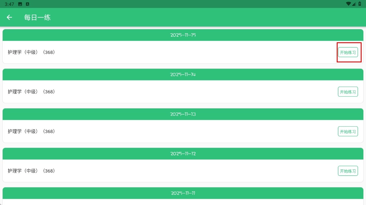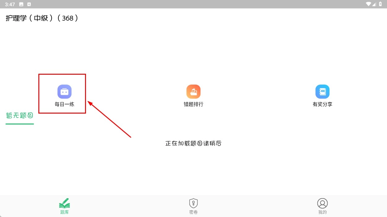 1、在護(hù)理學(xué)(中級)題庫頁面,找到并點(diǎn)擊【每日一練】功能模塊,即可進(jìn)入每日一練的列表頁面。