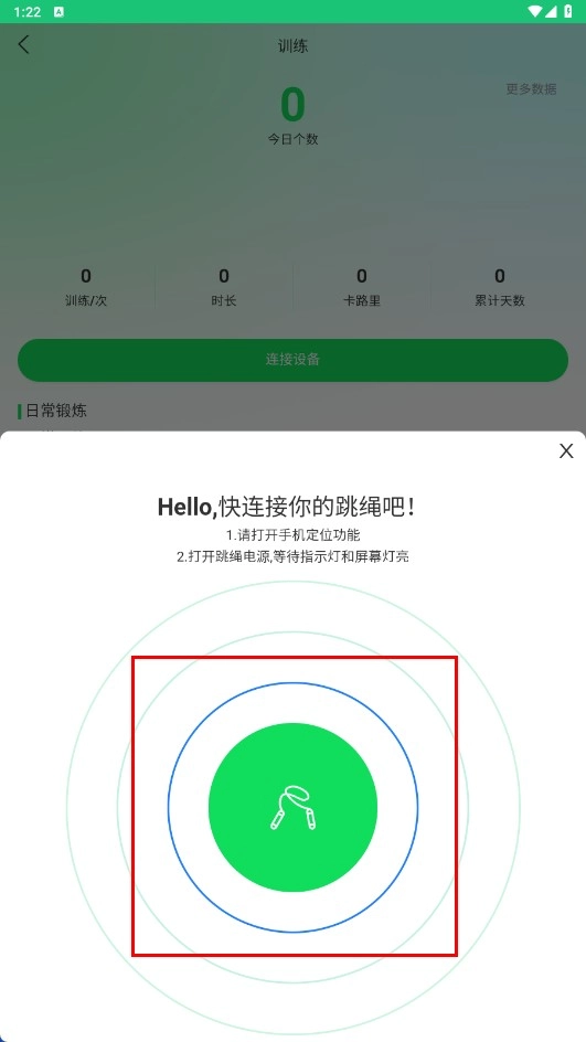 4、按照提示打開手機(jī)定位功能和跳繩電源,點擊跳繩連接圖標(biāo)完成設(shè)備連接。