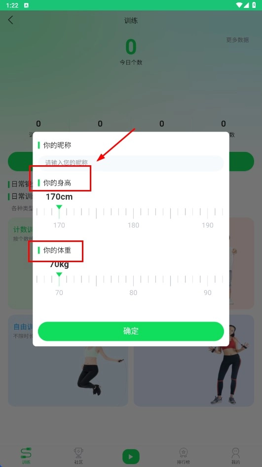 2、在彈出的設(shè)置框,輸入昵稱,設(shè)置身高、體重后點擊【確定-功能按鈕】。