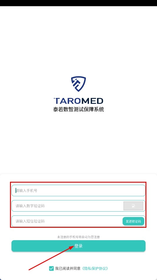 2、在登錄頁(yè)面輸入手機(jī)號(hào)、數(shù)字驗(yàn)證碼和短信驗(yàn)證碼,點(diǎn)擊【登錄-功能按鈕】完成登錄。