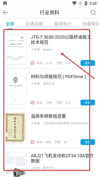 1、打開軟件首頁后,點(diǎn)擊【行業(yè)資料】分類入口,即可進(jìn)入行業(yè)資料板塊,該板塊內(nèi)還設(shè)有【交通運(yùn)輸】【能源電力】等細(xì)分領(lǐng)域。