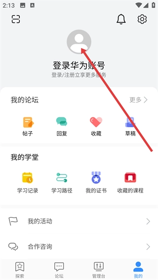 2、在個(gè)人頁(yè)面點(diǎn)擊【登錄華為賬號(hào)】區(qū)域,進(jìn)入華為賬號(hào)登錄/注冊(cè)界面。