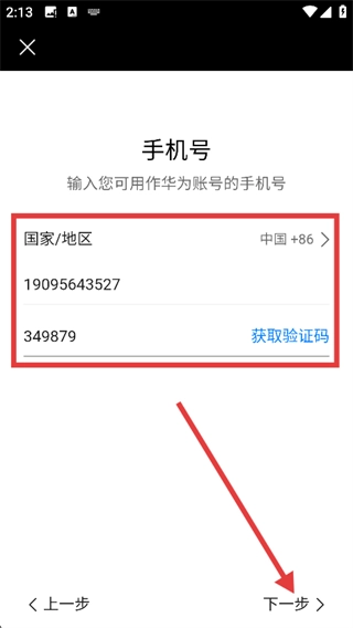 4、在手機(jī)號(hào)頁(yè)面選擇國(guó)家/地區(qū),輸入手機(jī)號(hào)并獲取驗(yàn)證碼,填寫(xiě)后點(diǎn)擊【下一步】,完成華為賬號(hào)注冊(cè)流程。