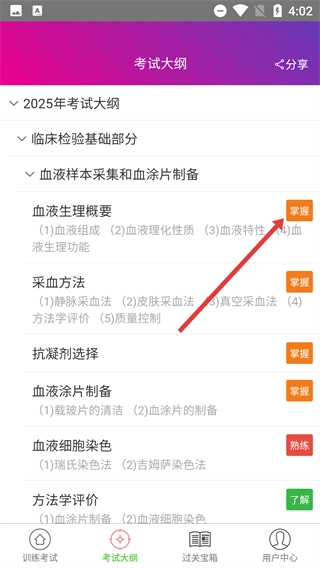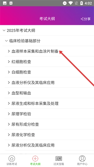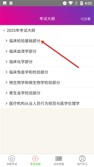 1、打開【考試大綱】頁面,能查看【2025年考試大綱】包含的【臨床檢驗基礎部分】【臨床血液學部分】等內容板塊,挑選相應板塊即可啟動學習。