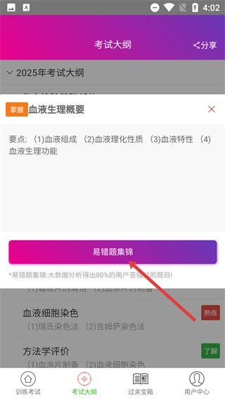 4、點擊具體知識點如【血液生理概要】,可查看其要點,還能點擊【易錯題集錦】,練習大數(shù)據(jù)分析得出的易錯題,強化知識點掌握。