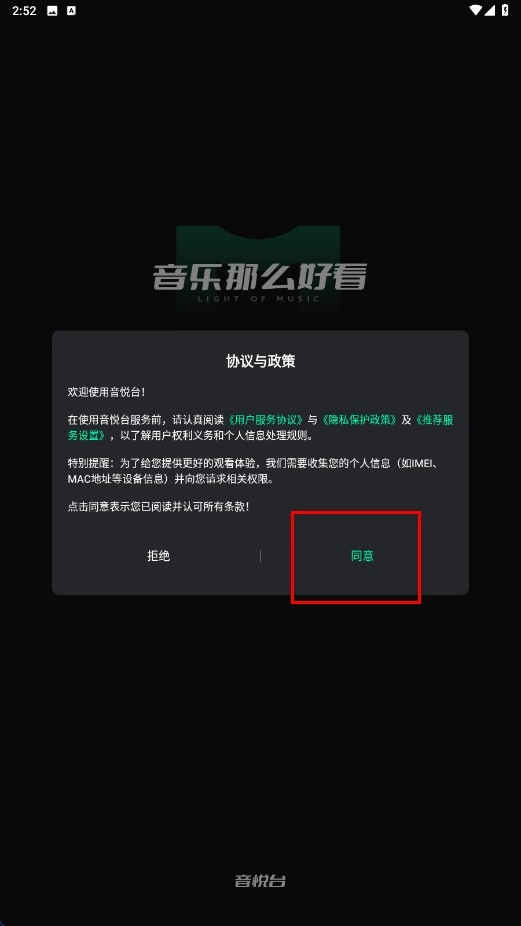 1、點擊【同意-功能按鈕】,以此確認音悅臺的用戶服務協(xié)議、隱私保護政策以及推薦服務設(shè)置。