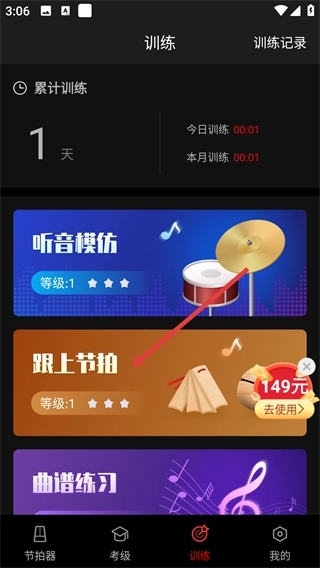 2、在訓(xùn)練頁面,選擇【跟上節(jié)拍】訓(xùn)練項目,可參與該節(jié)奏訓(xùn)練活動。
