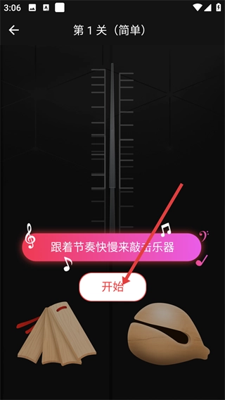 4、進入第1關(guān)(簡單)后,點擊【開始】按鈕,即可跟隨節(jié)奏敲擊樂器,進行節(jié)奏訓(xùn)練。