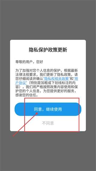 1、在隱私保護(hù)政策更新頁面,點(diǎn)擊【同意并繼續(xù)使用】按鈕,即可繼續(xù)使用該軟件。