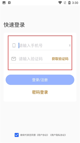 3、在快速登錄頁面,輸入【手機(jī)號】,點(diǎn)擊【獲取驗(yàn)證碼】并輸入,然后點(diǎn)擊【登錄/注冊】按鈕。
