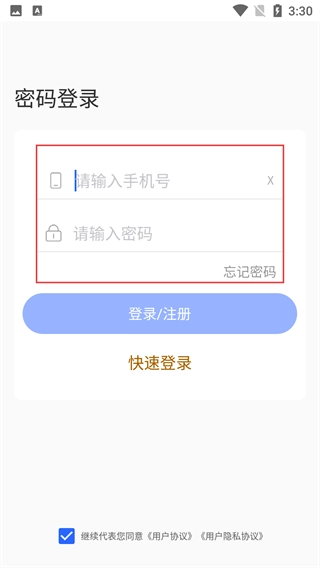 4、在密碼登錄頁面,輸入【手機(jī)號】和【密碼】,點(diǎn)擊【登錄/注冊】按鈕完成登錄。