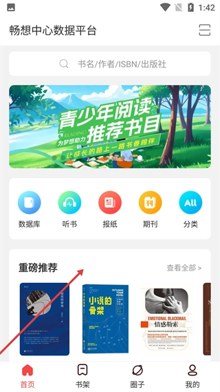 4、注冊(cè)登錄后進(jìn)入【暢想中心數(shù)據(jù)平臺(tái)】首頁(yè),可通過(guò)搜索框檢索圖書,也可使用【數(shù)據(jù)庫(kù)】【聽書】等功能。