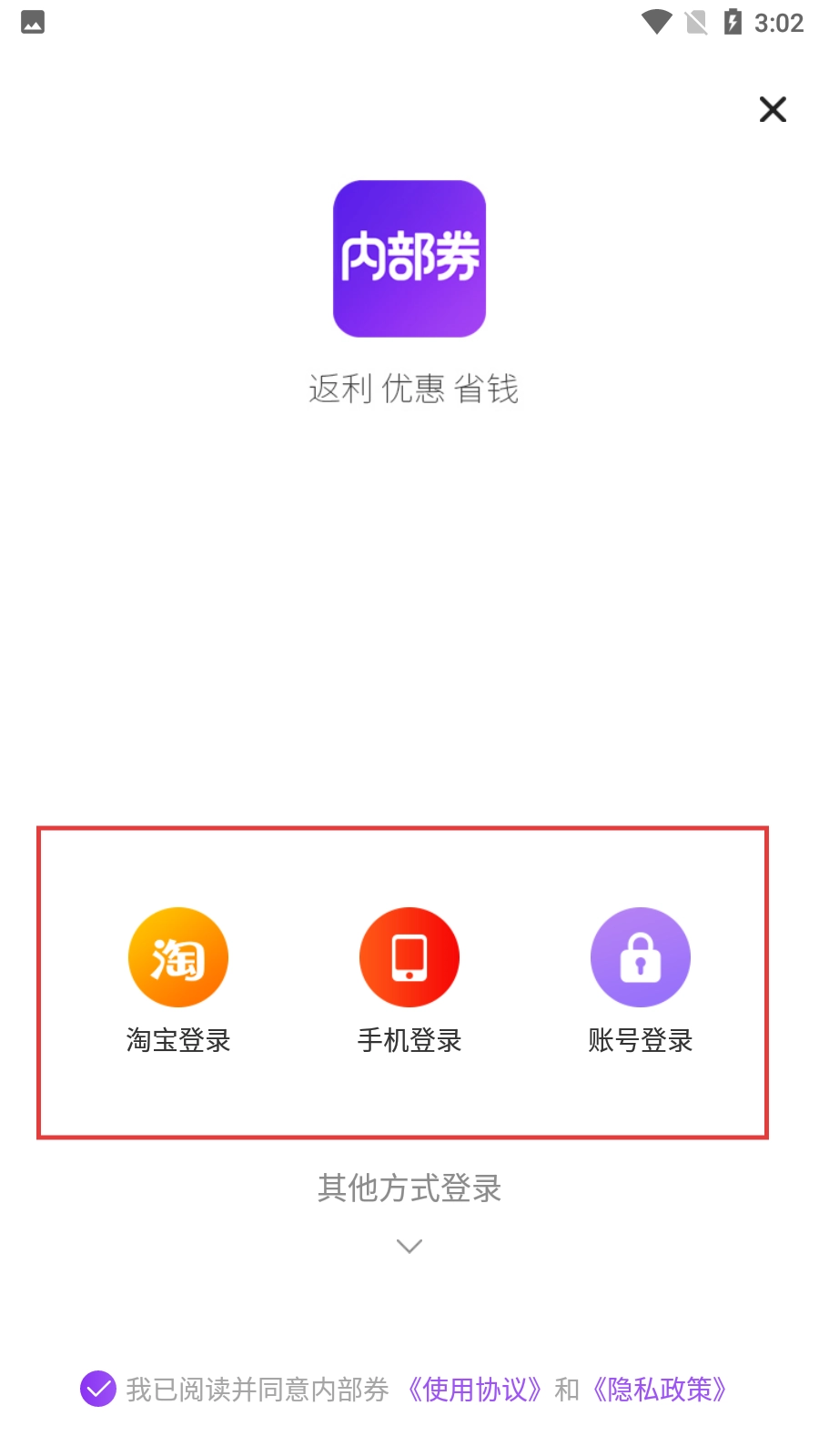 3、在登錄選擇界面,可選擇【淘寶登錄】、【手機(jī)登錄】或【賬號登錄】三種方式進(jìn)行登錄。