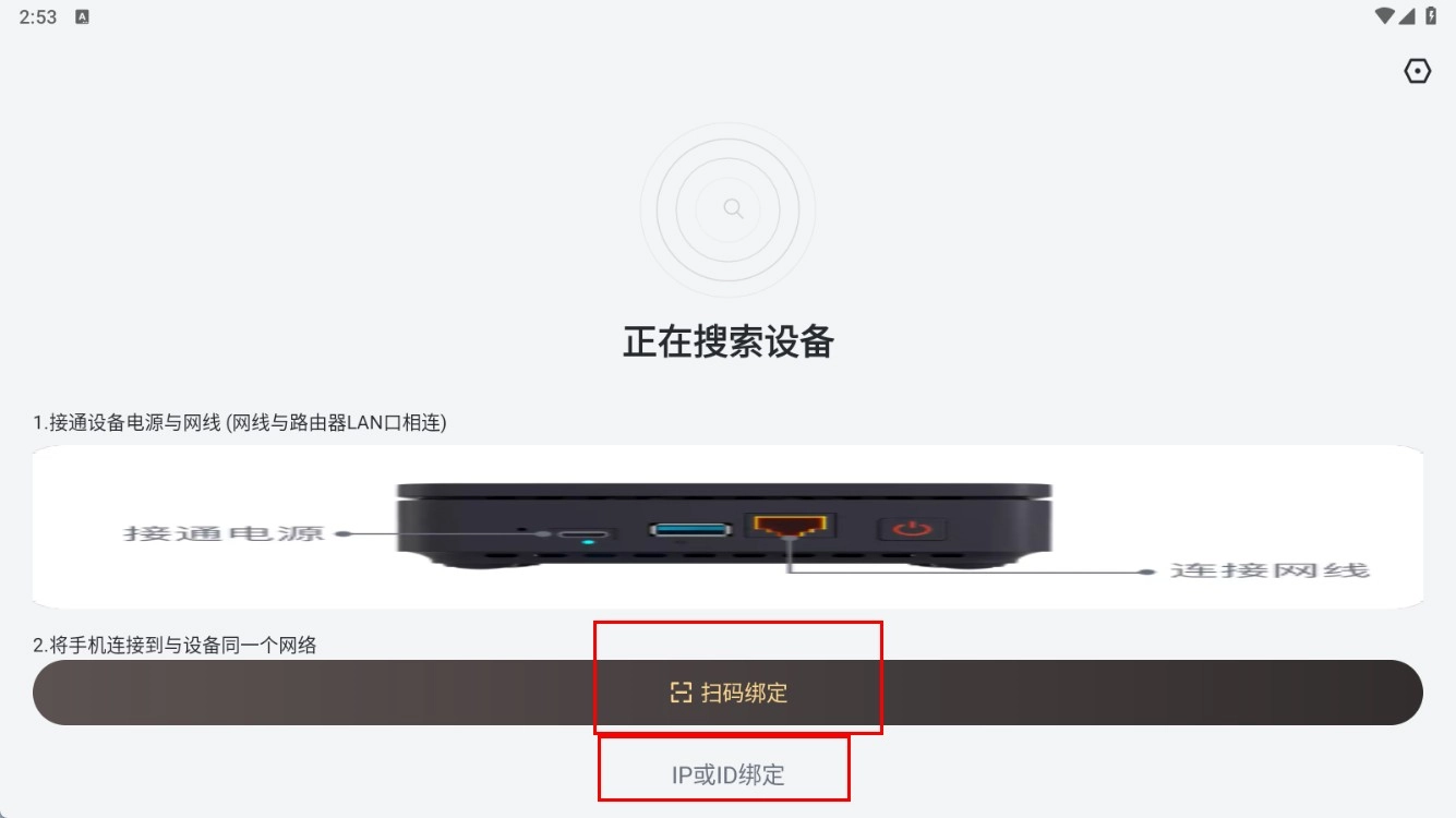 2、在設(shè)備搜索頁(yè)面,可選擇【掃碼綁定】或【IP或ID綁定】方式進(jìn)行設(shè)備綁定。