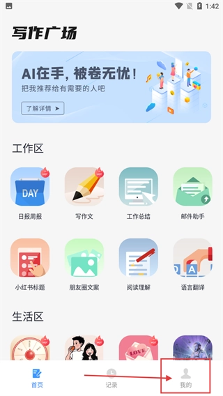 在寫(xiě)作廣場(chǎng)首頁(yè),點(diǎn)擊右下角的【我的】按鈕,就能進(jìn)入個(gè)人中心頁(yè)面。
