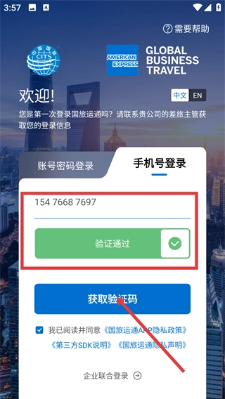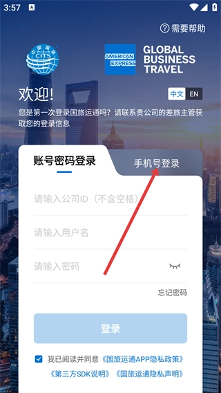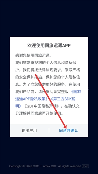 在國旅運(yùn)通隱私政策提示頁面,點(diǎn)擊【同意并確認(rèn)】按鈕,即可進(jìn)入登錄界面。