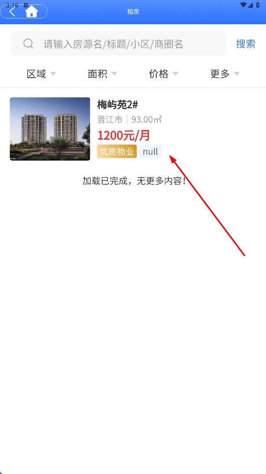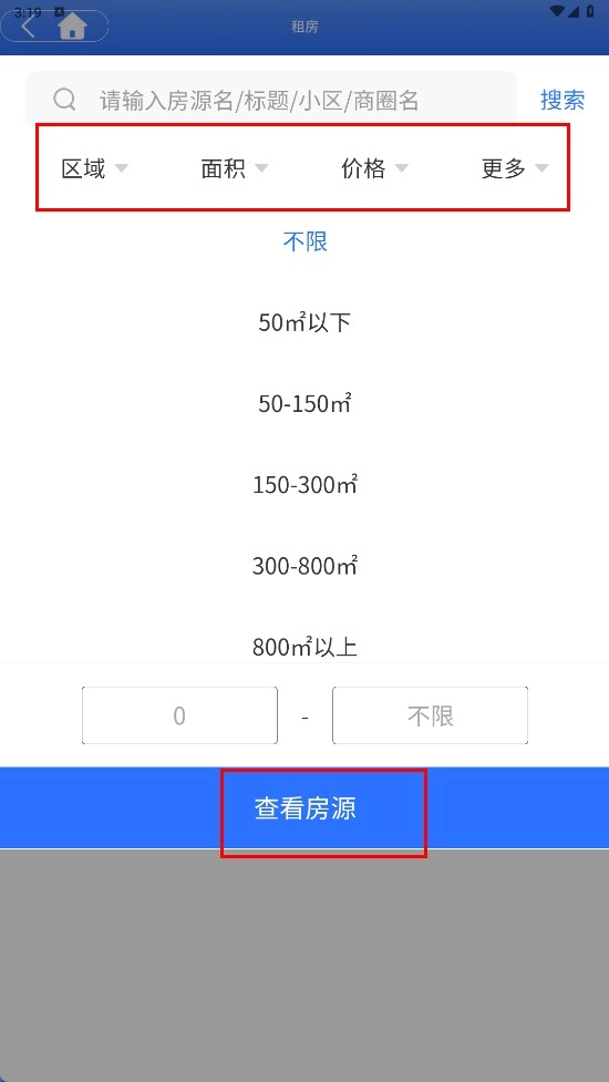 2、在租房頁面,可通過選擇區(qū)域、面積、價格等條件后,點擊【查看房源-功能按鈕】,查看符合條件的出租房源。