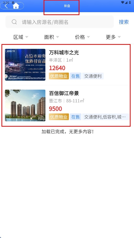 4、點擊【新盤-分類標簽】,進入新盤頁面,可查看如萬科城市之光、百信御江帝景等新盤信息。