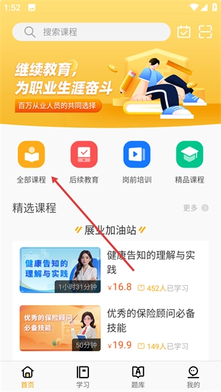 1、點擊【全部課程】選項,進(jìn)入培訓(xùn)報名頁面。