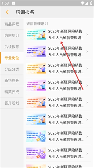 3、在專業(yè)崗位類培訓(xùn)課程中選擇目標(biāo)課程,如【2025年新疆保險銷售從業(yè)人員誠信管理培訓(xùn)】。