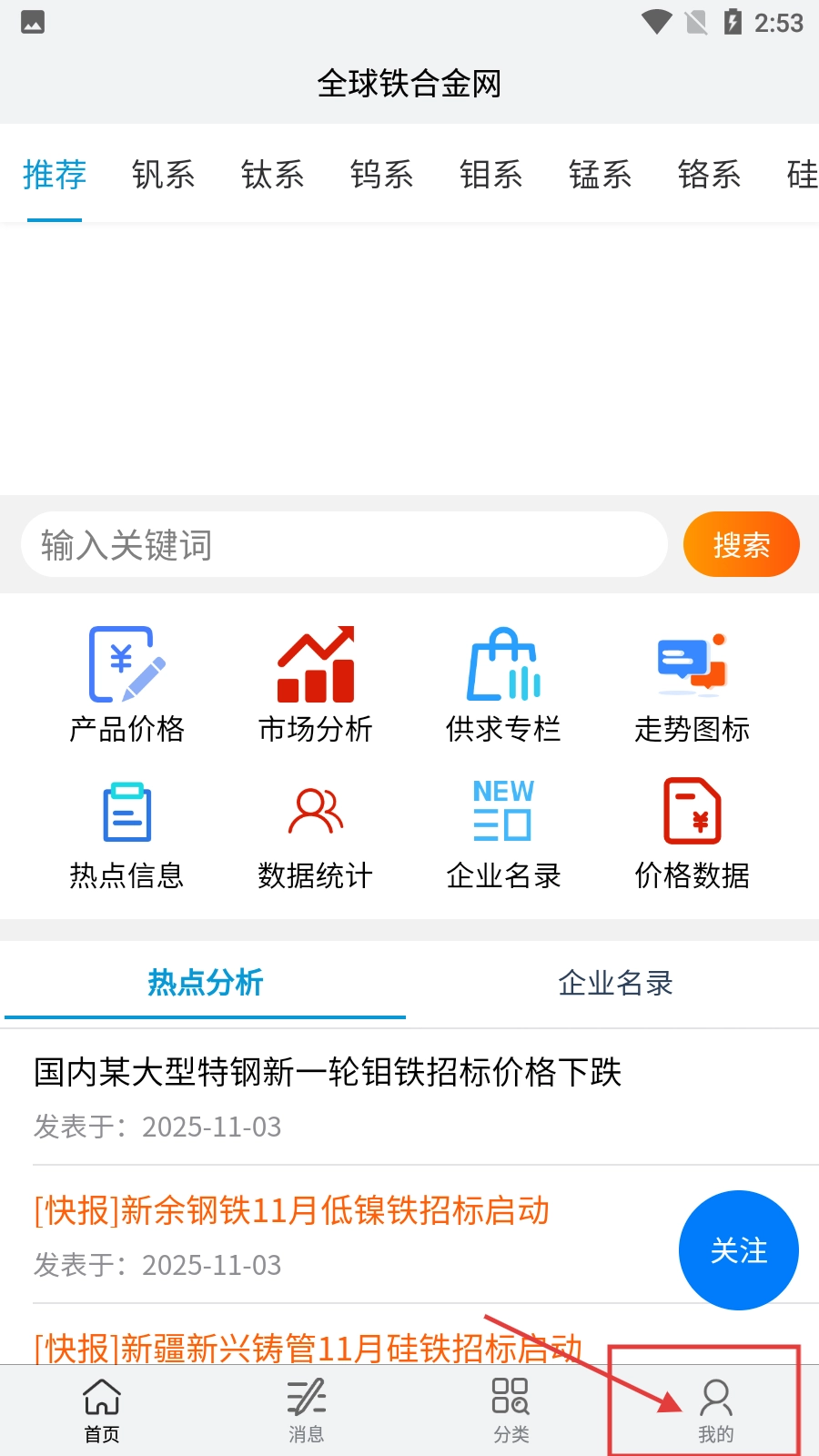 1、在【全球鐵合金網(wǎng)】首頁,點擊右下角的【我的】按鈕,就能進入個人中心界面。