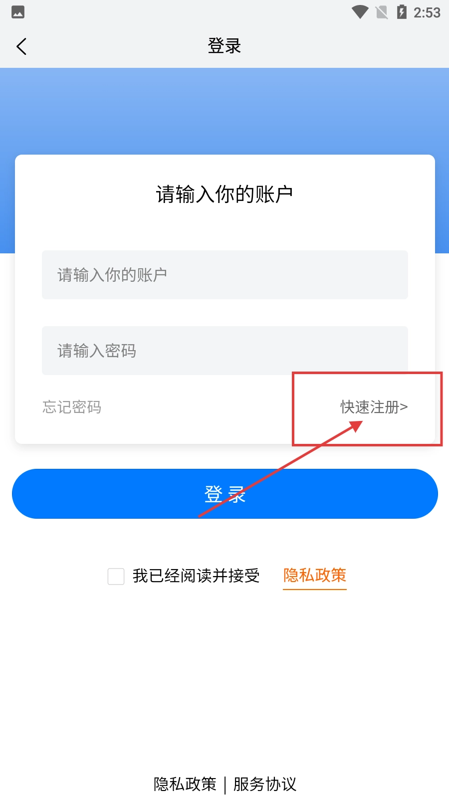 3、在登錄界面,若未注冊賬號,可點擊【快速注冊】按鈕進行賬號注冊。