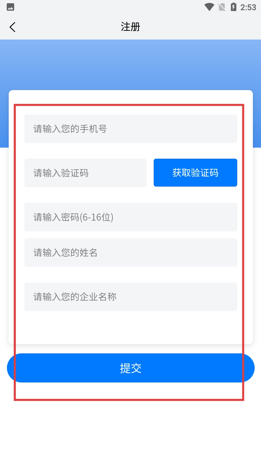 4、在注冊界面,依次填寫【手機號】、獲取并輸入【驗證碼】、設置【密碼】、然后點擊【提交】按鈕完成注冊。