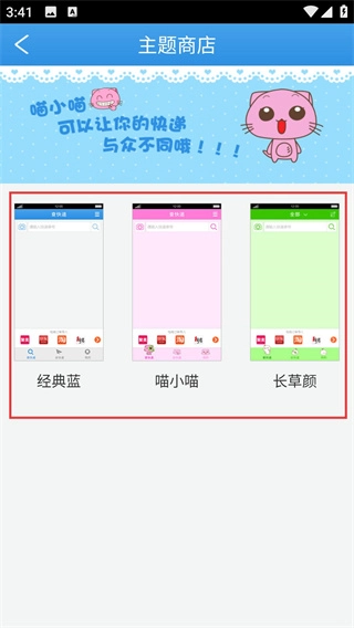 4、在主題商店界面,可選擇【經(jīng)典藍(lán)】【喵小喵】【長草顏】等主題,更換界面風(fēng)格。