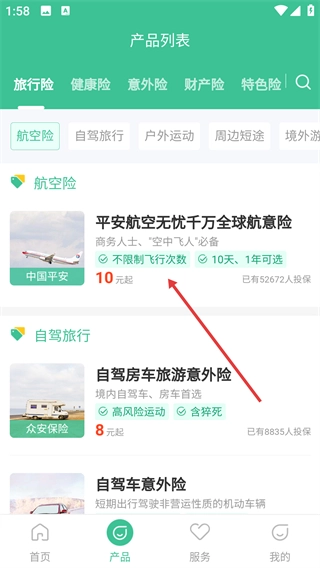 2、在產(chǎn)品列表界面選擇【平安航空無(wú)憂千萬(wàn)全球航意險(xiǎn)】產(chǎn)品,進(jìn)入產(chǎn)品詳情頁(yè)面。