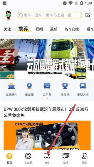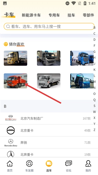 1、在首頁點擊底部的【選車】按鈕,即可進(jìn)入選車板塊,開啟卡車車型的選擇流程。