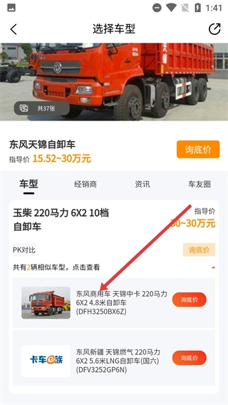 3、在選擇車型頁面,點擊具體車型(如東風(fēng)商用車天錦中卡220馬力6X24.8米自卸車),進(jìn)入車型詳情頁。