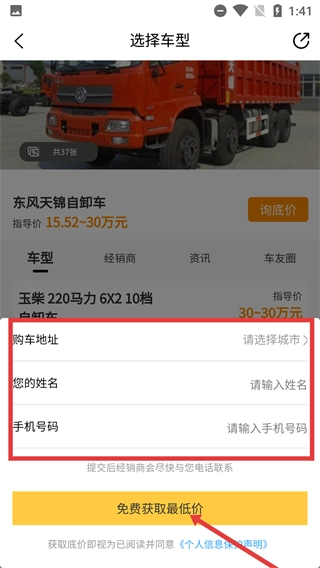 4、在車型詳情頁,填寫【購車地址】【您的姓名】【手機(jī)號碼】后,點擊【免費(fèi)獲取最低價】,即可獲取車型底價信息。