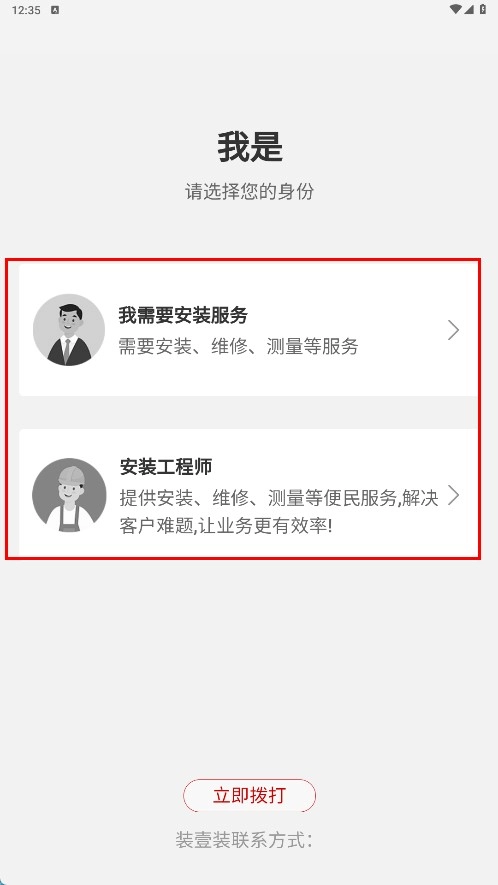 2、在身份選擇界面,可選擇【我需要安裝服務(wù)】或【安裝工程師】身份。