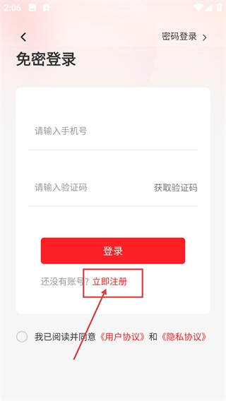 3、在登錄界面,若沒有賬號,點擊【立即注冊】按鈕,進入注冊頁面。