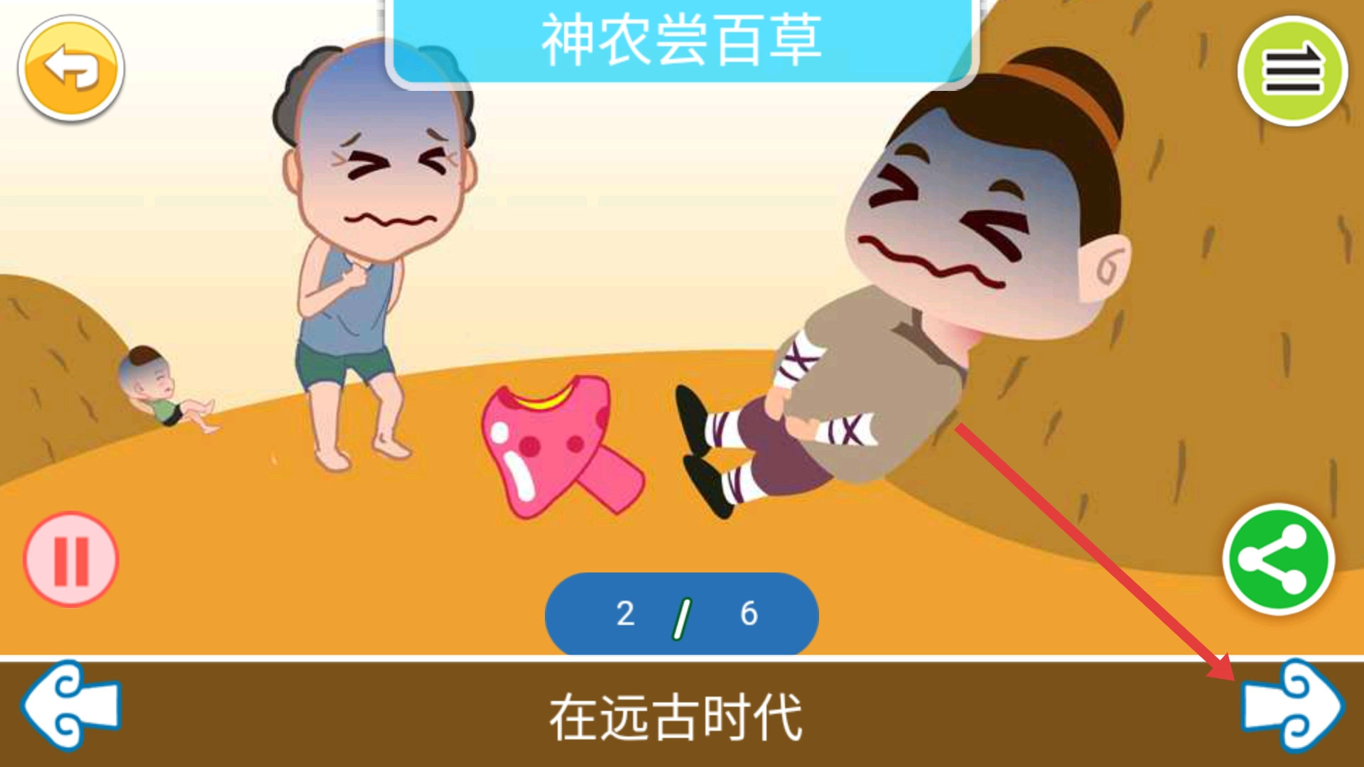 4、在動畫播放頁,可觀看【神農(nóng)嘗百草】的動畫內(nèi)容,點擊右側(cè)箭頭可查看后續(xù)內(nèi)容。