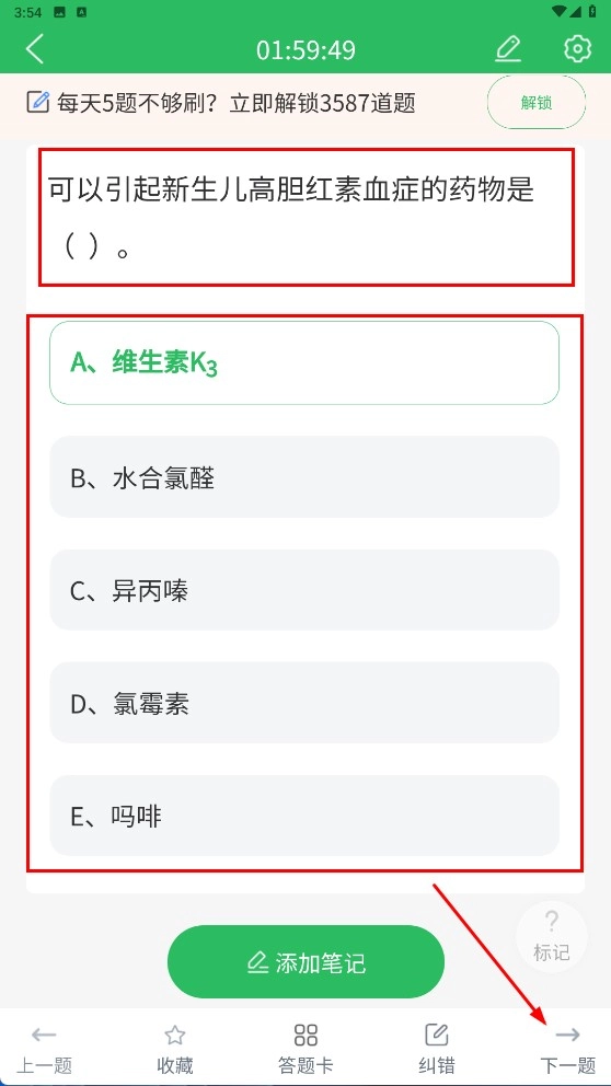 2、在題目練習(xí)頁,選擇答案后,點(diǎn)擊【下一題-功能按鈕】繼續(xù)答題。