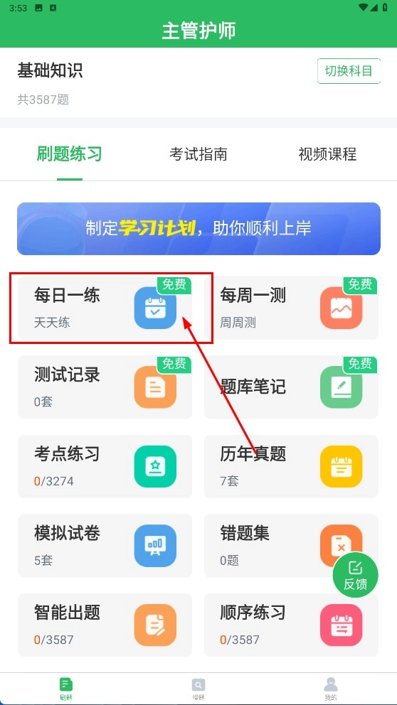 1、在主管護(hù)師基礎(chǔ)知識(shí)頁面,找到并點(diǎn)擊【每日一練-功能模塊】,即可進(jìn)入題目練習(xí)頁面。