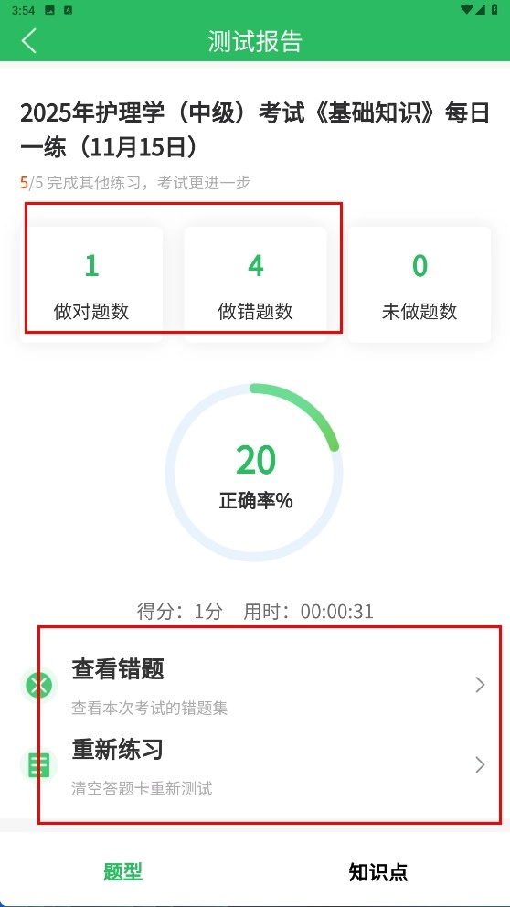 3、完成練習(xí)后,進(jìn)入測試報(bào)告頁,可查看做對(duì)題數(shù)、做錯(cuò)題數(shù)等,還能選擇【查看錯(cuò)題】或【重新練習(xí)-功能按鈕】。