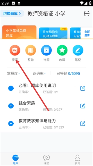 在【教師資格證-小學(xué)】題庫頁面,點擊【競賽】功能入口,即可參與答題競賽活動。