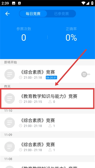 2、進(jìn)入競賽頁面后,選擇《教育教學(xué)知識與能力》競賽場次,該場次答題時間為21:00-21:15。