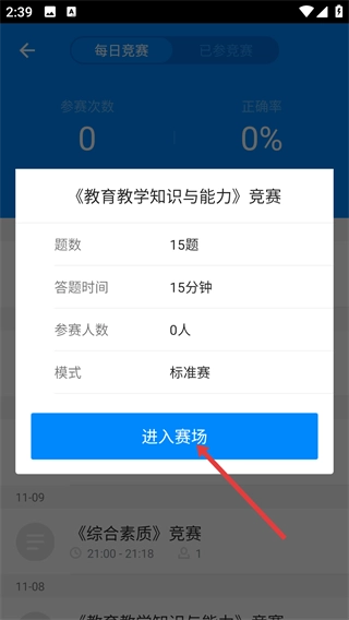 3、點擊選中的競賽場次后,在彈出的競賽信息框中,點擊【進(jìn)入賽場】按鈕,即可參與該競賽。