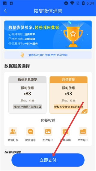 2、在恢復微信消息頁面,選擇數(shù)據(jù)服務套餐后,點擊【立即支付】按鈕,進入付款方式選擇頁面。