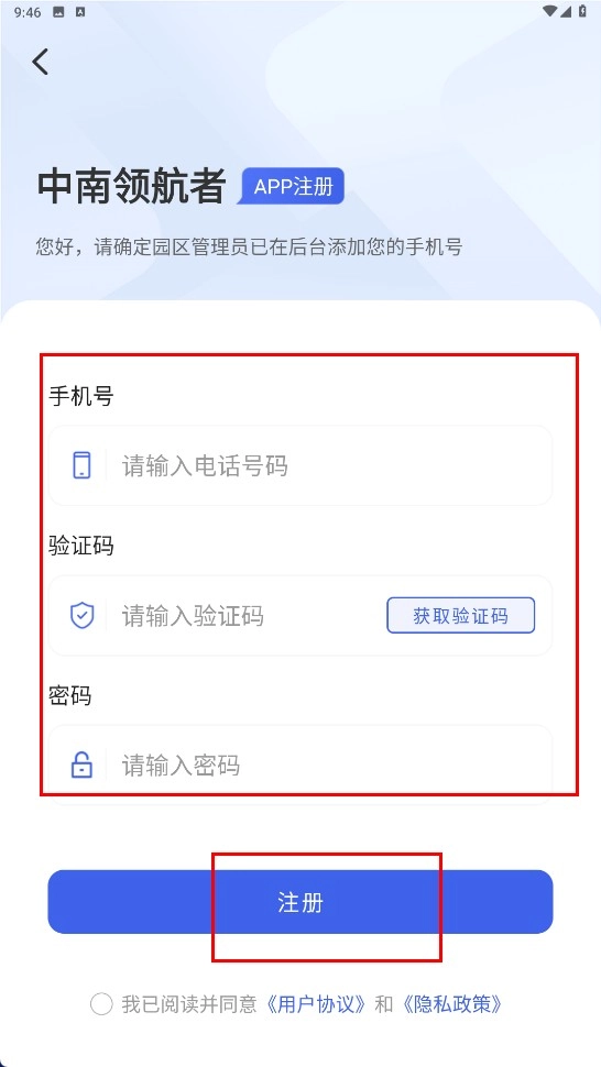 3、若沒有賬號,點擊【立即注冊】,進入注冊頁,輸入手機號、驗證碼、密碼,點擊【注冊】完成。