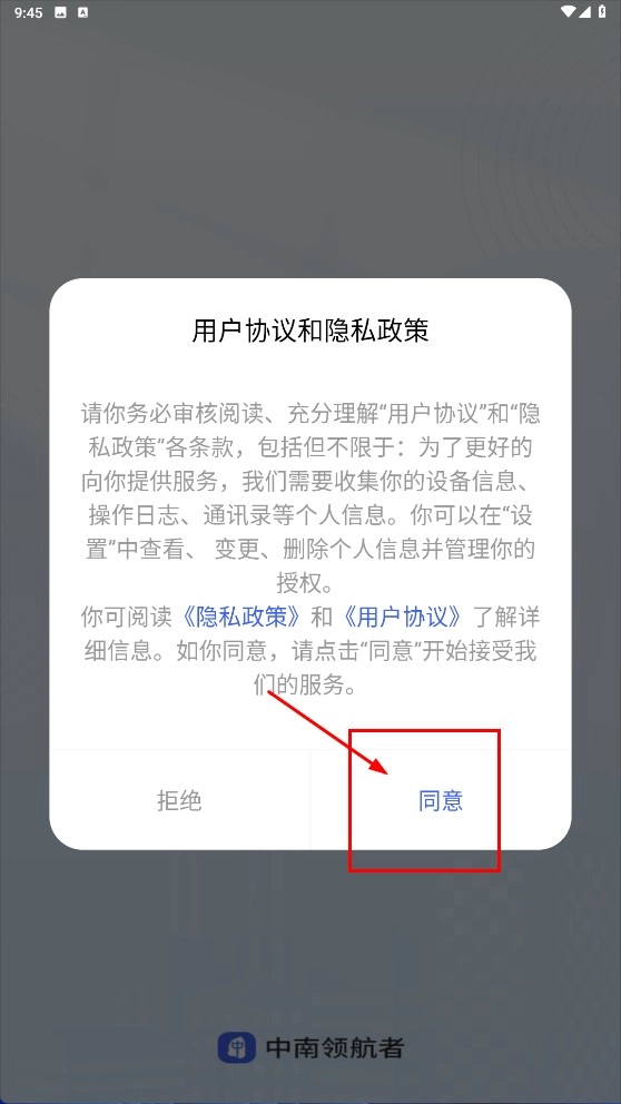 1、在彈出的用戶協(xié)議與隱私政策窗口里,點擊【同意】功能按鈕,即可進入登錄頁面。