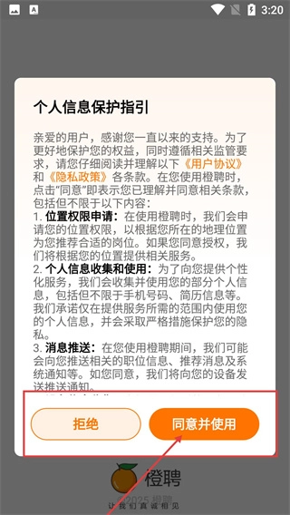 1、當(dāng)橙聘啟動后,閱讀個人信息保護指引,隨后點擊“同意并使用”按鈕,即可進(jìn)入應(yīng)用的使用流程。