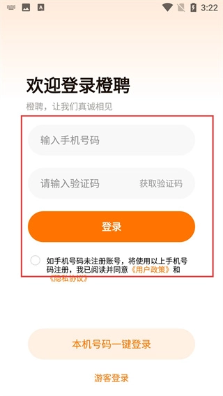 2、進(jìn)入橙聘登錄頁面,可選擇輸入手機號碼+驗證碼的方式登錄,也可選擇本機號碼一鍵登錄或游客登錄。