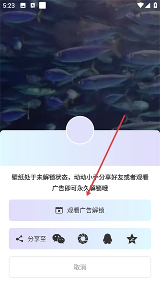 4、選擇【觀看廣告解鎖】或分享好友的方式,解鎖壁紙后完成設(shè)置操作。