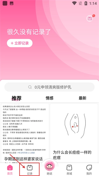 1、打開大姨媽APP進入首頁后,點擊底部導航欄中的【記錄】圖標,即可進入記錄頁面。